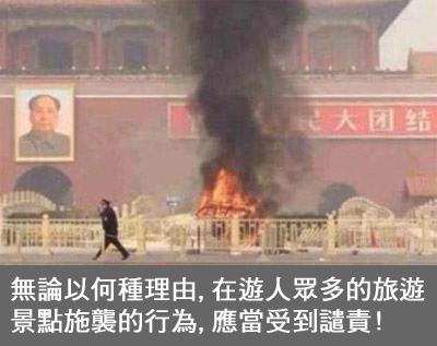 天安門廣場與故宮是到北京的旅遊重點, 每日有數以萬計中外遊客匯聚, 如果在這裡進行恐怖襲擊, 肯定會對遊人造成重大傷亡, 無論自殺式襲擊份子持什麼由, 針對平民百姓的襲擊, 是屬不能認同, 應受到社會譴責的行為,