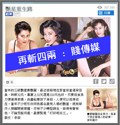 最新一期《壹週刊》就把笑貧不笑娼的缺德文化發揮得淋漓盡致,發表了一篇文章題為「冇富商包 為兩餐脫星鄭艷麗麥記賣包」,誠屬賤到冇朋友之作。