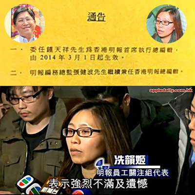 日月神報大老闆終於出手, 公佈委任鍾天祥為首席執行總編輯, 權力在編務總監兼總編輯張健波之下, 「明報員工關注組」代表冼韻姬對今次人事任命感到強烈不滿和遺憾, 指 " 張健波放假, 鍾天祥可以定頭版或換頭版 " , " 他對香港事務未熟悉, 有咁大權力好令人憂慮 " , " 希望張健波監察鍾天祥表現, 若發現有違明報一貫方針, 必須嚴厲處理 ",