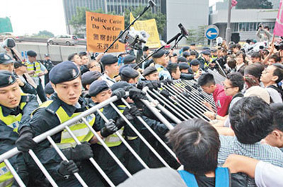 當遊行隊伍抵達添馬街時,示威者因遊行路線問題與警方對峙,雙方更發生推撞,有人拉扯鐵馬,警員則兩度施放胡椒噴霧,部分示威者包括立法會議員梁國雄被噴中。期間又有示威者突破警方防線衝出夏愨道,令警方一度要封鎖現場,致交通受阻。