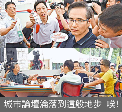 昨天香港電台城市論壇淪為鬧劇, 鏡頭前衹見李卓人, 黃洋達兩人在搶咪對罵, 主持人謝志峰控制不了場面, 束手無策, 期間又發生了一段插曲, 「保衛香港運動」人士因未獲邀請出席論壇, 蹴場抗議,