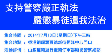 " 愛港之聲 " 在今日下午發起撐警活動, 由銅鑼灣遊行至警察總部,由於反對派激進黨團人士近期發起的暴力衝擊行動, 踐踏香港法治精神, 香港警察在 " 衝擊立法會 " 與 " 預演佔中 " 事件中嚴正執法, 表現出警隊應有的專業素質, 但卻為泛民黨團組織人士無理攻擊, 指為濫用武力, 對警隊實屬不公, 主辦團體希望透過行動表達市民對警隊的支持,