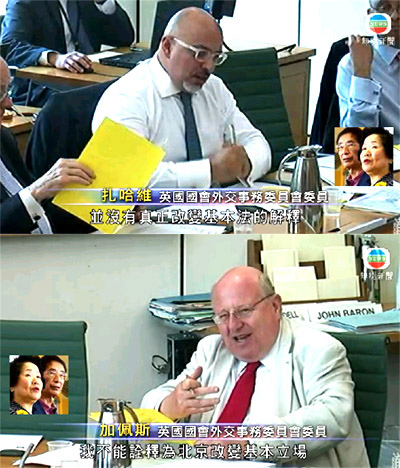 不過, 這次兩人到英國 " 求援 " 卻碰了一鼻子灰, 在聽證會上被委員會質疑誇大其詞, 指國務院發表的白皮書 " 並沒布真正改變基本法的解釋 ", " 我不能詮釋為北京改變基本立場 ",