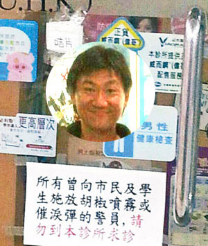 【本報訊】佔中行動引起的社會對立未止,網上流傳一張照片,指於葵涌廣場開設診所的西醫王俊傑,於診所外張貼告示,稱「所有曾向市民及學生施放胡椒噴霧或催淚彈的警員,請勿到本診所求診」引發爭議,有網民質疑他違反醫德,亦有網民予以支持。