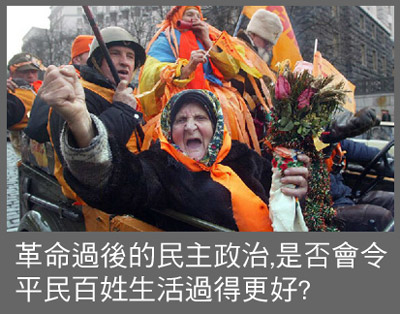 如上文作者所指, 民主政治如果處在一個國民的國家認同出現問題, 宗教有嚴重對立, 處於國際重大勢力爭奪的夾縫中, 而國家又無力抗拒外力的干預, 這民主政治的推行無疑是火上加油, 令政府更難於施政甚至下台, 更加速國家的紛亂甚至分裂, 如果外力扶植的傀儡政權上場更可能令國家資源流失, 淪為附庸國, 中東與東歐 " 顏色革命 " 後的國家, 便是很好的例子.