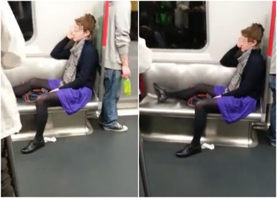 短片在港鐵車廂上拍攝,一名穿黑衣紫裙的外國女子背靠玻璃,橫坐在座椅上。她除了以椅背墊手托腮,其中一隻穿鞋的腳還跨在座位上,一個人霸佔了三個位。片中可見車廂不算太逼,但洋女周圍仍有數名站立的乘客,卻沒有人上前阻止。