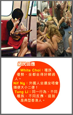 前日有網民將在地鐵拍得三名16、17歲外籍少女,懶理旁人目光在車廂席地而坐,還有講有笑,相片上載討論區專頁,標題「強國人蹲港鐵=冇文化唔文明,人見人憎!外國人瞓港鐵=??」。