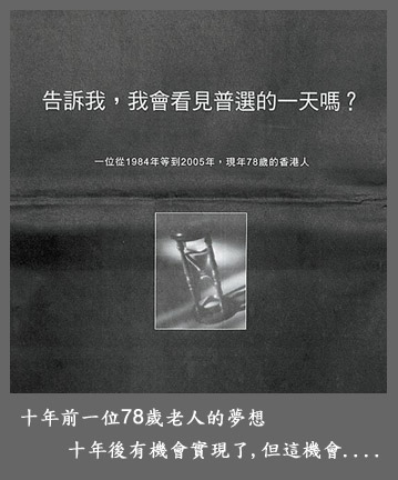 記得十年前的2005年, 一位78歲的 " 民主老人 " 自資在報張刊登廣告, 衹有13隻字 " 告訴我, 我會看見普選的一天嗎? ", 令社會震撼, 從2005年到2015年, 過去十年了, 現在終於有機會令這位現年88歲的老人家實現夢想, 可以看見有普選的一天, 可惜卻被泛民黨團議員卡在立法會, 這位老人家的夢想可能無了期的延續下去, 令人神傷, 如今爭取 " 真普選 " 的人卻不敢再拿這老人的廣告說事, 再拿來刊報, 因為親手破滅了老人夢想的, 正正就是這些爭取 " 真普選 " 的人士,