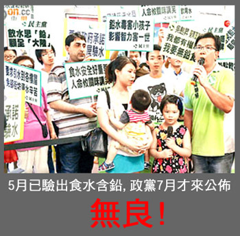 至於政黨 " 抽水 " 嘛, 已是見怪不怪, 不抽水才奇, 不過5月份已驗出食水含鉛, 到7月份才向社會公佈, 是否為配合年底的區議會選舉, 因而故意將事件延後引爆邀功, 如果是真的話, 那又是否十分無良, 把政治利益凌駕於市民健康之上呢?