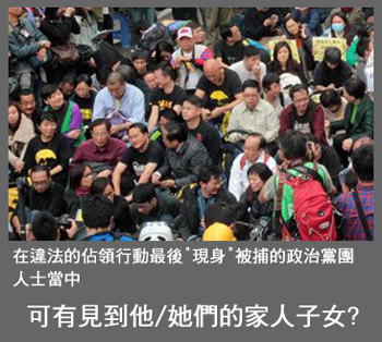 可這位超級大狀有否身體力行, 彰顯 " 責任 ", 把子女孫兒推到抗爭前線呢? 似乎沒有 , " 公民抗命 ", " 違法佔中 " 都衹見某超級大狀影單隻影 " 上陣 ", 未見有如某些 " 怪獸家長 " 般, 攜同子女甚至未成年兒童與及手抱嬰兒的 " 踴躍響應 " , 他 / 她們的子女孫兒去了那裡?