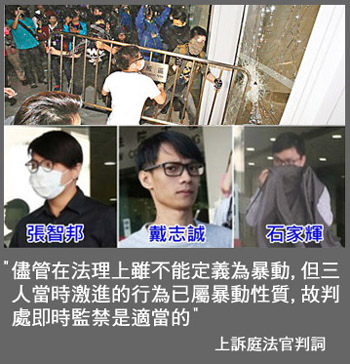 香港文匯報訊(記者 杜法祖)3名青年在前年非法「佔領」期間,因網上謠傳將審議版權修訂條例而衝擊立法會,造成嚴重的破壞,其後被判150小時社會服務令。當時,律政司認為判罰過輕,提出刑期覆核後,3人遭改判監3個半月。3人早前上訴被高等法院駁回,更即時收監。法官昨日頒下判決理由書,批評3人衝擊立法會的激進行為恍如暴動,法庭絕不容許不負責任的違法行為,故即使上訴人初犯,仍須面對阻嚇性的刑罰,而判監是合適的決定。