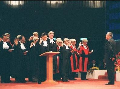 國法官宣誓要對女皇及其繼承人依法效忠(IwillbefaithfulandbeartrueallegiancetoHerMajestyQueenElizabeththeSecond,herheirsandsuccessors,accordingtolaw.)