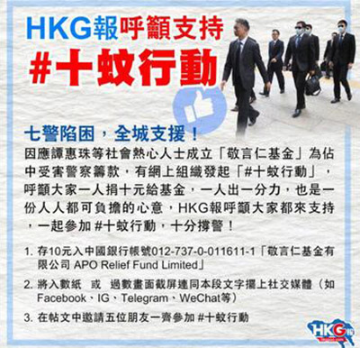 七警陷困,全城支援!因應譚惠珠等社會熱心人士成立「敬言仁基金」為佔中受害警察籌款,有網上組織發起「#十蚊行動」,呼籲大家一人捐十元給基金,一人出一分力,也是一份人人都可負擔的心意,HKG報呼籲大家都來支持,一起參加#十蚊行動,十分撐警!