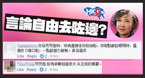 有人指摘芳芳姐:「蕭芳芳竟然替689 2.0 – 一個過去幾年破壞香港程序公義的大旗手做啦啦隊,香港人終於看清楚您人面背後的醜惡。」一句話透露了這些黃色惡霸的動機——只因她支持的是他們不喜歡的林鄭;只因她支持的是他們無理認定是「梁振英2.0」的林鄭;只因她支持的不是黃絲鍵盤戰士心儀的John曾或者胡官。