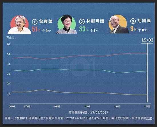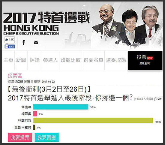 至今日截稿為止,「網濟通」和《晴報》聯合舉辦網上投票「【最後衝刺(3月2日至26日)】2017特首選舉進入最後階段,你撐邊一個?」,共有9,727人參與,其中林鄭月娥的支持為63%,遙遙領先;曾俊華的支持度為34%;胡國興則只有可憐的2%人支持;還有1%的投票者選擇「全部不支持」。