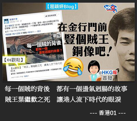 ------ " 每一個賊的背後 都有一個盪氣迥腸的故事", " 賊王葉繼歡之死 讓港人流下時代的眼淚 " ------