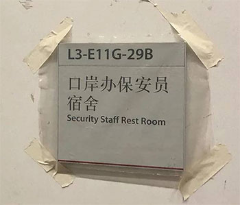 日月神報所附新聞圖片亦顯示, 設施房間門外的說明是Security Staff Rest Room (口岸辦保安員宿舍), 這中文譯名顯然是翻譯錯誤, 應是口岸辦保安員休息室才對,