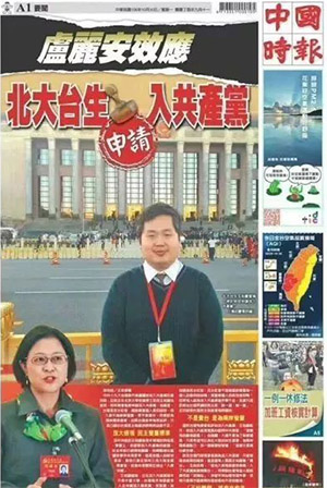 近日臺灣《中國時報》在頭版頭條刊登了北大台生王裕慶申請加入共產黨的報導,並稱這是“盧麗安效應”。