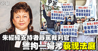 退休警司朱經緯以警棍打人罪成,本月3日被判監禁3個月。數十名支持者當日在法院門外,大鬧主任裁判官錢禮是「狗官」、「殘害忠良」等。警方經調查,今日拘捕一名63歲女子,涉嫌藐視法庭。