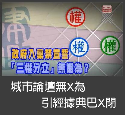 我可不是無中生有故弄玄虛的,十月二十三日,香港電台電視部《城市論壇》的討論題目,就是以此三字作標題:「政府入稟禁宣誓,三權分立無能為?」橫看豎看,都覺得它意有所指,如果以鴨脷洲口音讀出,更肯定是粗言無疑。