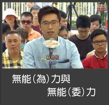 十月二十三日香港電台電視部《城市論壇》節目主持人的開場白, 把當日題目「政府入稟禁宣誓,三權分立無能為?」中的「為」字讀成「委」音, 而不是港台所辯解的「無能為力」, 為字應讀成「維」音, 為何會有這種現象, 硬把「無能為(力)」讀成「無能委(力)」, 值得網友深思,