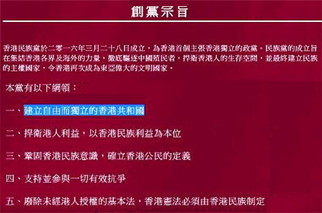 這等政黨綱領本來可歸入言論範疇, 政治人物 " 吹水 " 是屬常態, 不能當真, 但後來陳浩天赴台與台獨人士串聯開會, 在發言時表明 " 香港民族黨是主張香港獨立的政黨 ", 這就不是那麼一回事了,