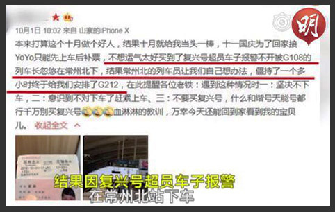 時值「十一黃金周」,不少內地居民會趁假期去旅行,其中一種交通工具是高鐵。周一(10月1日)是「黃金周」首天,有內地網民表示,乘高鐵買短途票上車,預備補票前往目的地時,列車因太多人補票而超載。車上職員廣播稱「列車已無力運行」,呼籲「無票旅客抓緊時間下車」。
