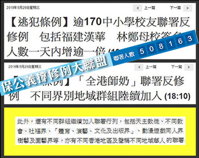 而這等所謂 " 群組 " 自認是包括天主教徒、不同教會、社福界、體育、演藝、文化及出版界、動漫遊戲同人界、樹藝及園藝界等, 差不多囊括全港各個界別, 看起來比市民自發響應支持《逃犯條例》修訂在網上聯署的聲勢大得多,