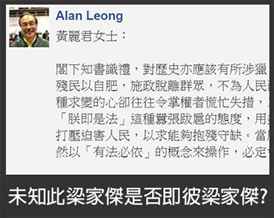 筆者不知道回應黃麗君撰文的人, 是否公民黨前主席梁家傑, 亦無法證明 ( 因現時網上A貨太多 ), 如果真是梁大狀的話, 筆者真為梁大狀的精神狀況身體健康擔心,