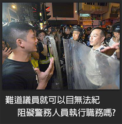 我們的反對派議員在歷次的社會騷亂及暴動中都對違法人士 " 十分包容 ", 除不予譴責外, 更將責任扣到政府頭上, 對警察執行法紀回復社會秩序的行動諸多挑剔, 雞蛋裡挑骨頭, 甚至站在警察清場隊伍前阻礙警察前進, 為堵路的違法人士 " 爭取 " 逃離現場的時間, 如果是普通人, 早已被拘捕並控以阻礙警務人員執行職務罪名, 可卻未見警察採取行動, 難道議員就可以目無法紀, 當真是 " 大晒 " 的嗎?