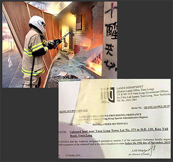 中國銀行多間分行過去幾月持續遭到破壞,落地玻璃被打爛、櫃員機屏幕遭打裂、銀行內外遭縱火等。中銀近期以木板或木夾鋼板保護銀行,早前已有消防處聲稱收到市民投訴。近日又有地政總署介入,該署表示收到有人投訴涉事的中銀元朗分行以圍板佔用道路,經調查後確定屬實,圍板佔據行人路的範圍較大,故採取執法行動,要求該分行於一個月內拆板。
